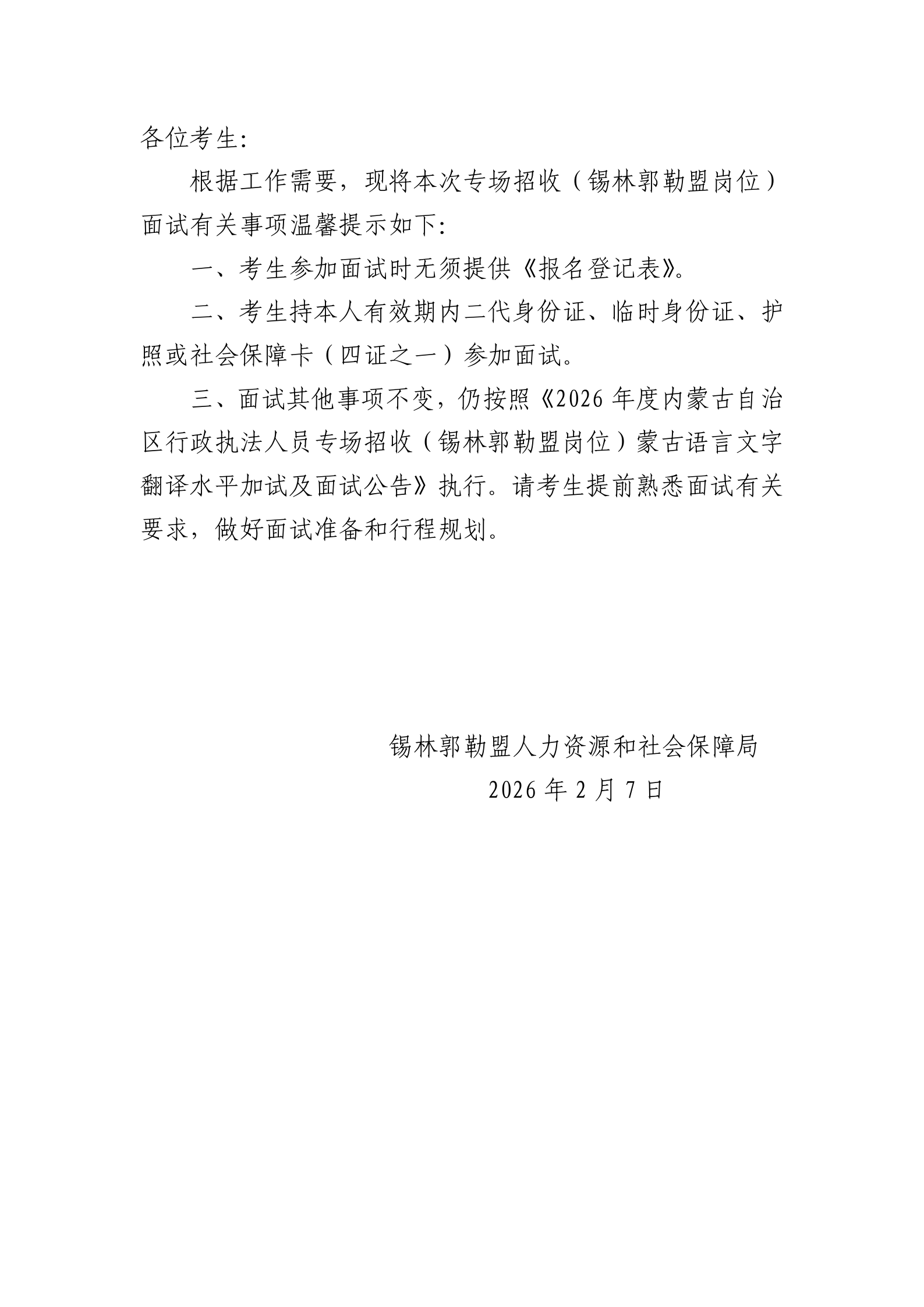 2026年度內(nèi)蒙古自治區(qū)行政執(zhí)法人員專場(chǎng)招收(錫林郭勒盟崗位)面試溫馨提示