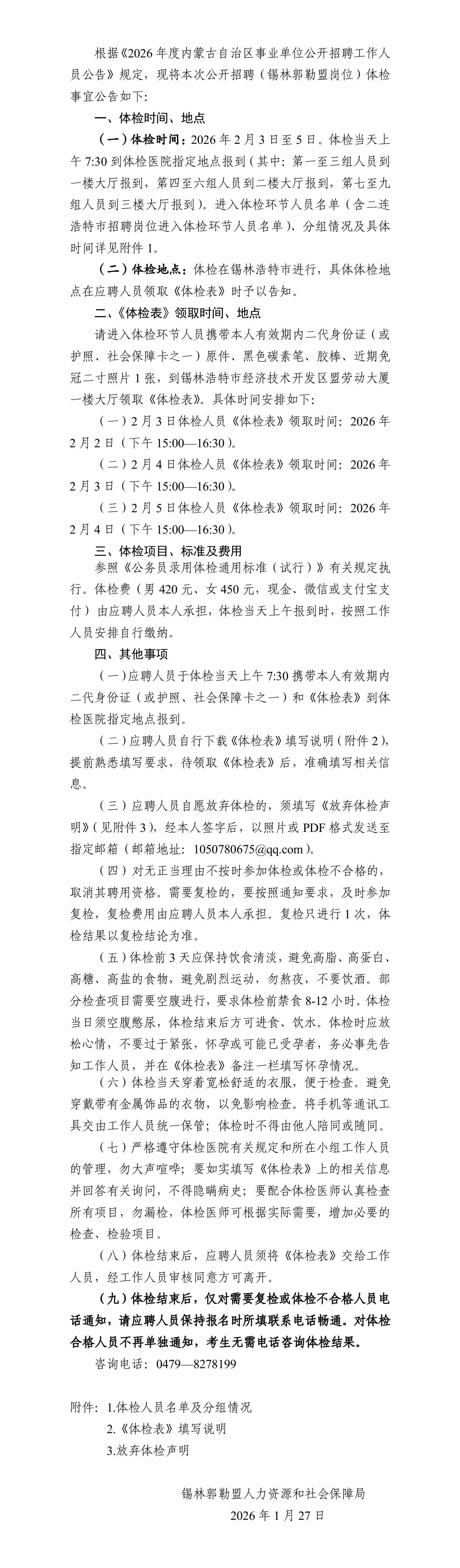 2026年度內(nèi)蒙古自治區(qū)事業(yè)單位公開招聘(錫林郭勒盟崗位)體檢公告