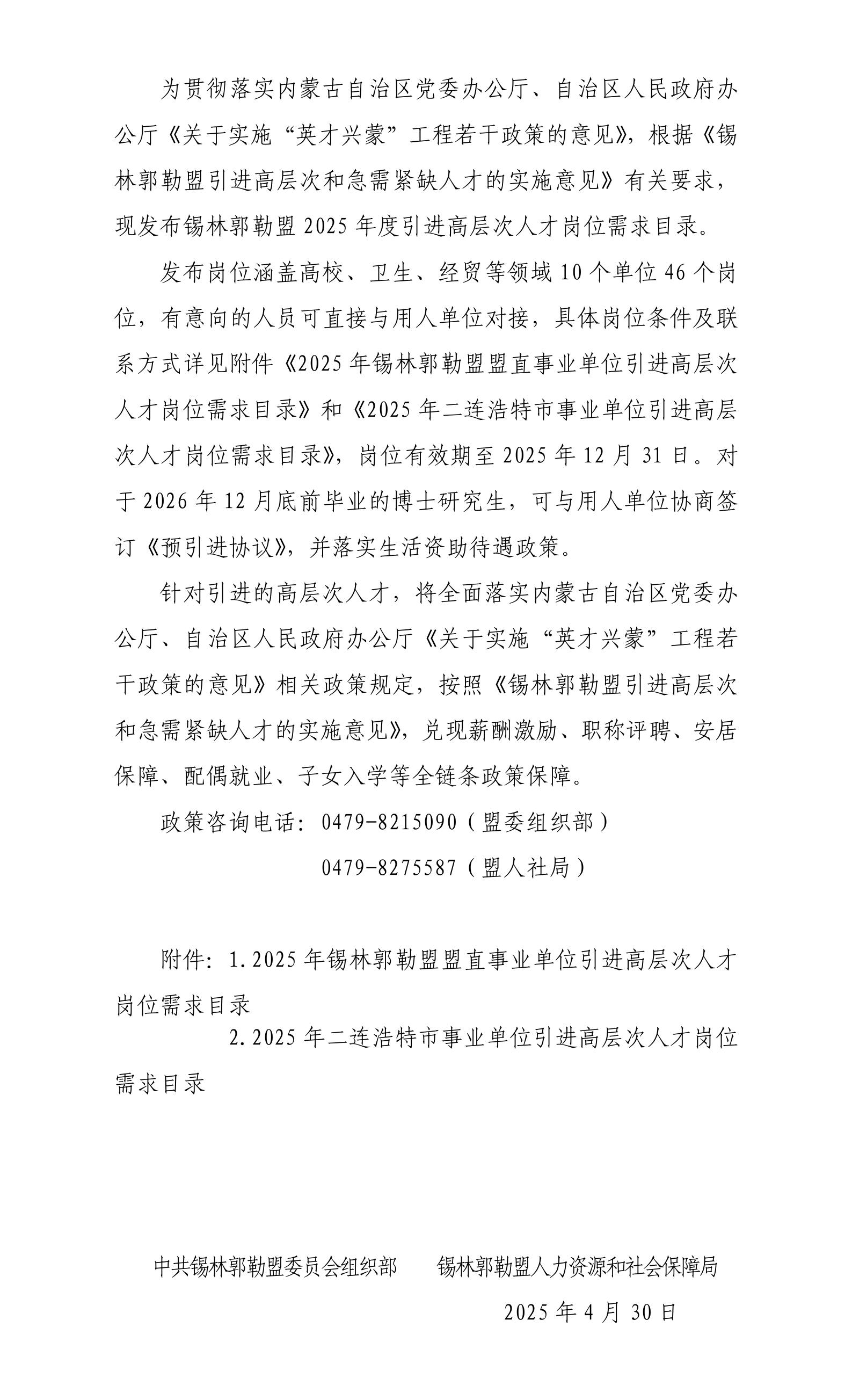 關(guān)于發(fā)布錫林郭勒盟2025年度引進(jìn)高層次人才需求目錄的公告